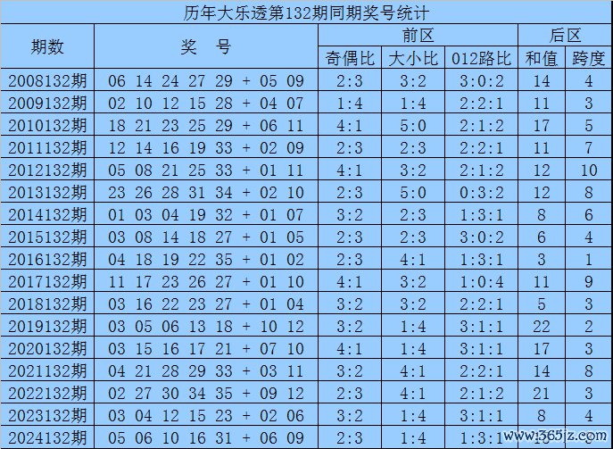 第2025131期大乐透奖号为03 08 25 29 32 + 09 12,其中前区号码奇偶比为3:2,大小比为3:2,012路比为1:1:3,后区号码和值为21,跨度为3。
